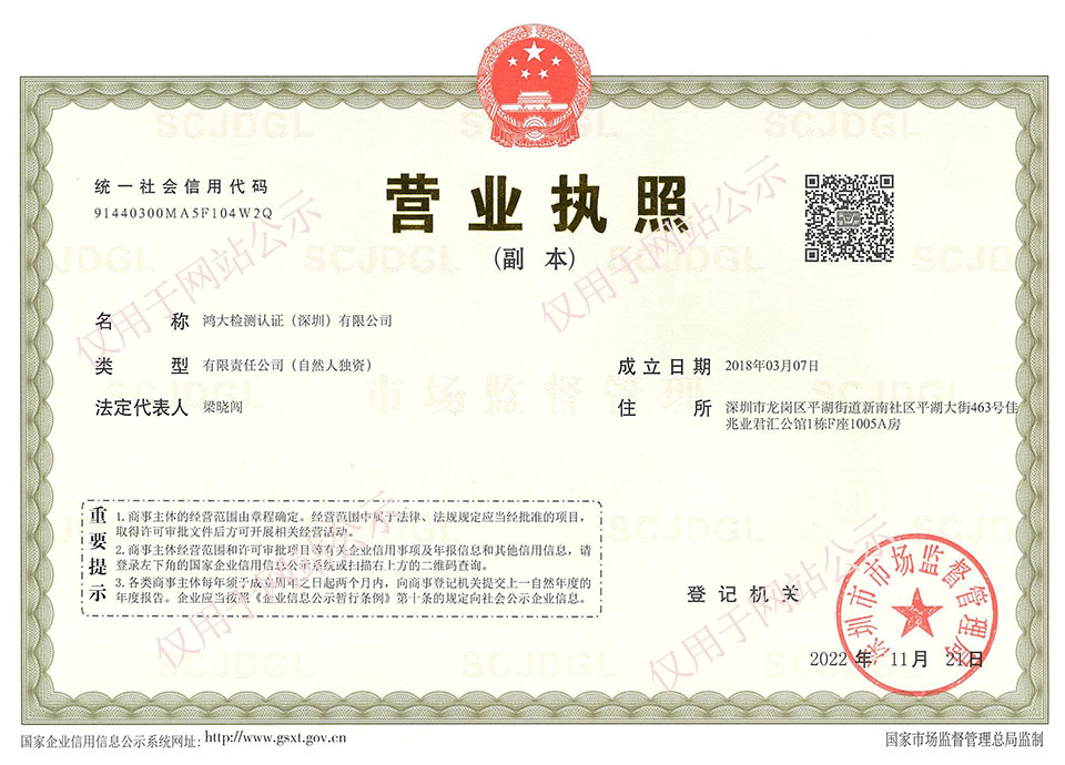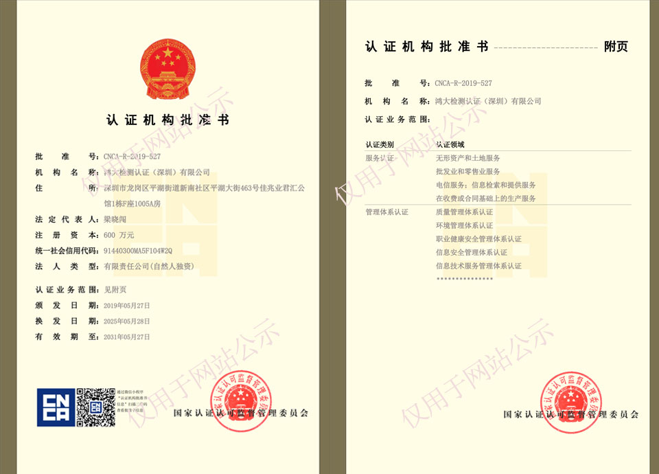鸿大检测认证(深圳)有限公司原名“深圳品上认证服务有限公司”,成立于2018年是3月,并于2019年5月获得认证机构资格,属于专业从事管理体系认证、服务认证的第三方认证机构,机构批准号为:CNCA-R-2019-527。鸿大的发展目标是集认证、检测、标准研发、标准技术信息提供于一体的综合性较大规模检测认证公司。鸿大的业务发展策略是先立足国内,然后踏上国际认证之路,面向全世界企业提供体系认证服务。鸿大的经营理念是:在全面、客观理解自身和行业核心价值的基础上,致力于认证机构基础性建设工作,努力让顾客更具竞争力,并更好的服务于社会,实现公司的发展与社会的发展统一。